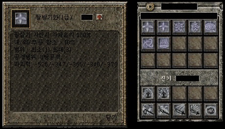 | 초식을 마우스 오른쪽 클릭했을 시에 초식 설명이 나와 있으며 빨간 화살표를 클릭하여 그 만큼의 진기를 올리면 2급으로 승급이 가능합니다. 진기 적용 시에는 절세 무공 창에 있는 진기 숫자가 그만큼 감소가 됩니다. | ||||||||||||||||||||||||