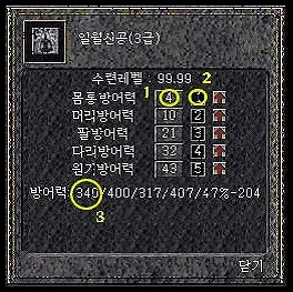 | - 1번칸의 숫자는 진기가 부여된 횟수를 의미합니다. 진기 부여 횟수는 총 99번까지 하실 수 있습니다. 즉 1번 칸의 숫자는 99까지 오를 수 있습니다. - 2번칸의 숫자는 1번칸의 숫자가 1씩 오를 때마다 필요한 진기 숫자를 나타냅니다. (1번의 숫자가 1의 자리일 때에는 2번 칸의 진기 점수가 1씩 필요하며, 1번칸이 10 ~ 20일 때에는 진기 점수 2씩 필요하며, 20 ~ 30일 경우에는 진기 점수 3점…씩 필요하게 됩니다.) - 2,4 번 칸의 숫자만큼의 진기가 적용될 때 마다 5번의 진기 점수는 그 수만큼 줄어들게 됩니다. - 1번의 숫자가 변화함에 따라 3번의 수치가 변하게 됩니다. - 빨간 화살표는 진기를 적용할 때에 사용되는 것으로, 적용할 수 있는 진기가 없거나 더 이상 진기를 적용시킬수 없을 때(최대 수치가 되었을시)에는 화살표가 사라지게 됩니다. |