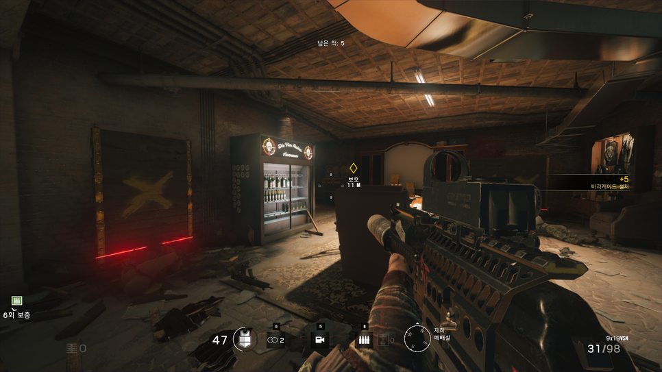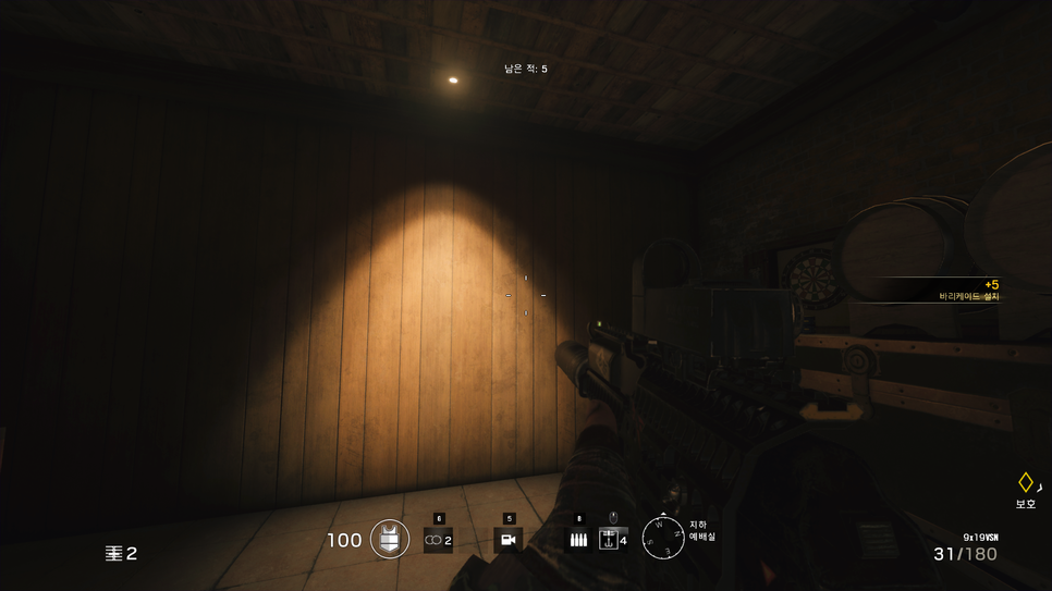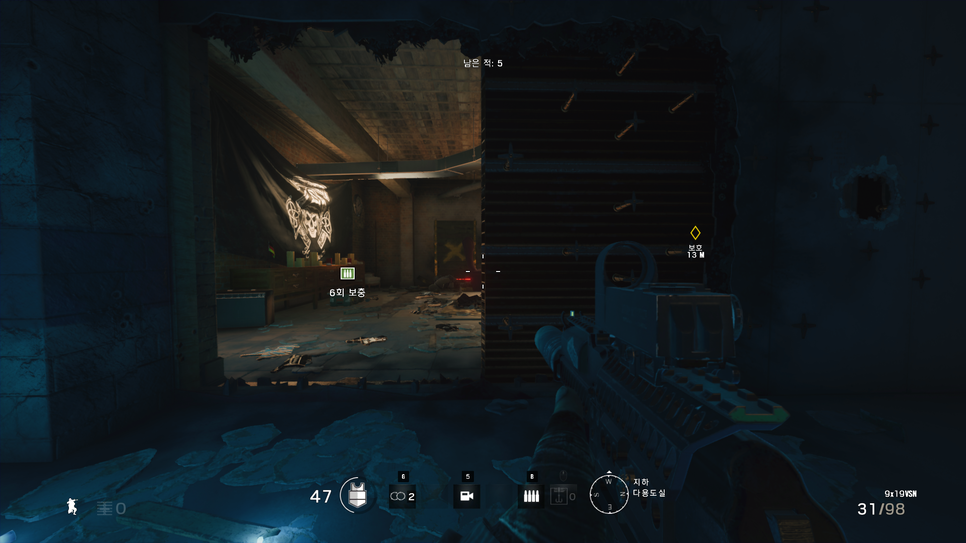 위를보면 역시 강화를 해놨지만 이렇게 벽을 뚫어놓고 그냥 간만보고 다른곳으로 들어오거나 하는 경우가 많습니다. 이같은 경우는 이 뚫린벽을 이용하여 옆으로 돌아가서 뒤를 노리거나 하는 방법 제일 대표적입니다. 아무리 테러리스트들이 1픽셀만 봐도 에임을하는 에임핵에 레이저총 발사를 가지고 있다고는 하지만 결국은 AI에 불과하기 때문에 조금 멍청합니다.