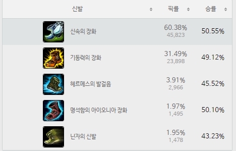 보통 전 기동력을 신습니다 근데 신속장화가 픽률이 좋네요