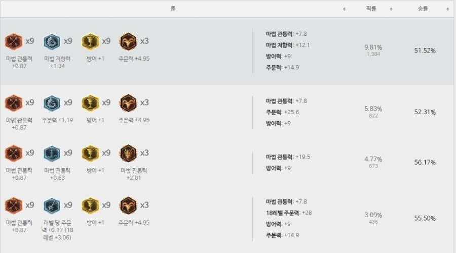 픽률은 주문력이 좋고 승률은 마관이 좋네요