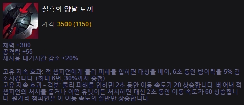 칠흑의 양날 도끼는 일라오이가 탑 라인을 갈 때 스테락과 함께 선택하는 1~2 코어 아이템인데, 버릴 옵션이 하나도 없는 꿀 아이템. 적당한 체력과 공격력은 말할 것도 없고, 방어력 디버프 옵션을 통해 적 탱커 라인을 좀 더 빠르게 정리할 수 있으며 이동속도 버프 옵션은 기타 교전 시 추노에 힘을 실어준다.