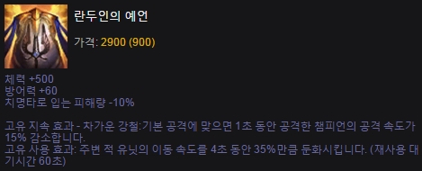 탱커라면 두 아이템 전부는 아니더라도 하나쯤은 항상 구입하게 된다. 망자의 갑옷은 이동속도 증가 옵션이 있어 시야장악에 힘을 실을 수 있고, 교전 시 적에게 접근하는 데 도움을 준다. 란두인의 예언은 적평타 딜러가 성장한 경우 치명타 데미지를 줄이는 것도 크지만, 주위 모든 적의 이동속도를 35% 낮추는광역 슬로우 옵션을 통해 일라오이 궁극기와의 시너지를 기대할 수 있는 것이 장점.