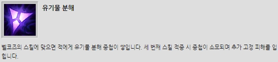 유기물 분해 3중첩이 쌓이면 고정 피해를 입힌다. '패시브 딜이 얼마나 되겠어' 할 수도 있지만 사실 벨코즈 딜의 핵심 중 하나가 이 '3타' 데미지이다.