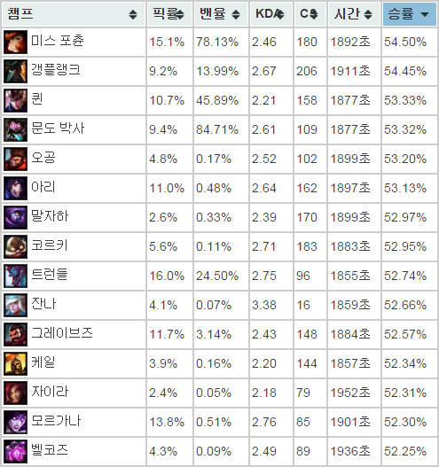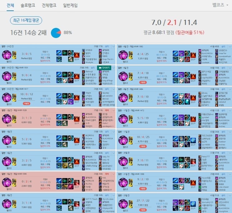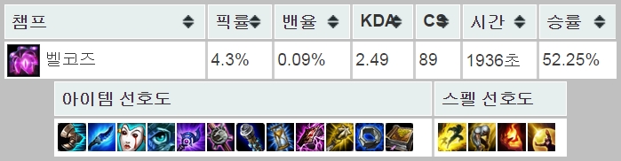 최근 1주일을 기준으로 벨코즈의 승률은 전체 128개 챔피언 중 15위로 정말 높은 편이다. 이쯤 되면 op라 칭해도 무리가 없을 듯.