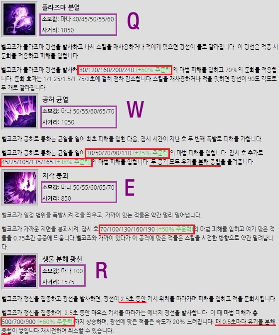 벨코즈의 스킬 설명이다. 잘 보면 각 스킬의 초반 마나 소모량이 적고 사거리가 무진장 길다(보라색 박스 참고). 또 모든 스킬이 딜링형 스킬이고 스킬 자체 깡뎀도 준수한 편이다(빨간색 박스 참고). 이미지엔 나와있지 않지만 스킬 쿨타임도 비교적 짧은 편인데 슬로우(Q, R)와 에어본(E)까지 갖췄다. 심지어 W는 2번까지 충전해서 연속으로 쓸 수 있고 Q의 슬로우 수치는 70%에 이른다.