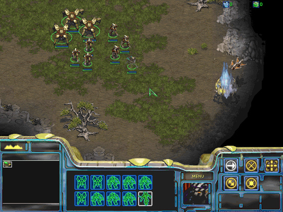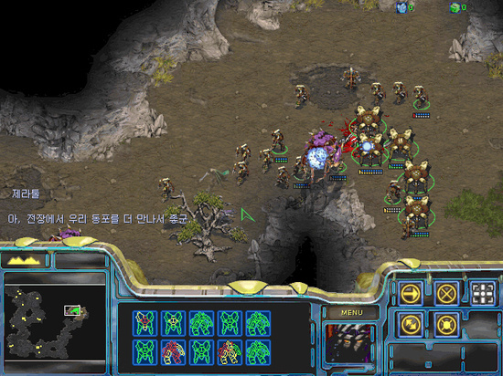 오른쪽으로 오시면 질럿 네마리와 울트라가 대치 중 가만히 놓아도 이기지만, 한기 한기가 아까우니