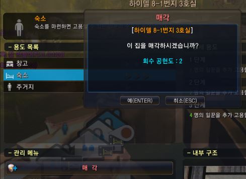 회수할땐 구매된 집을 눌러서 아래의 매각을 누르고 확인하면 즉시 매각이 됩니다