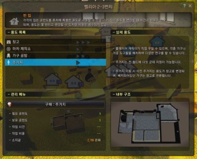 그럼 위와같이 뜨게되고 아래쪽에 "구매 : 주거지" 를 눌러주면 1~2분 가량 소모가 되며 집이 구매됩니다