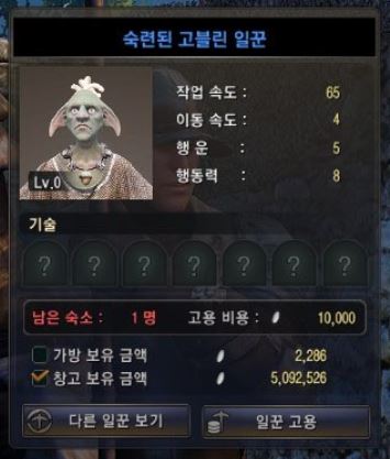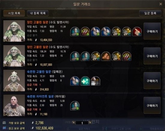 일꾼의 티어와 레벨에 따라 가격이 비싸지니 여유가 되시면 일꾼을 거래소에서 구매하셔도 무방하지만
