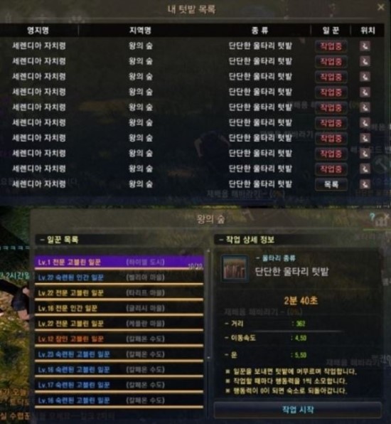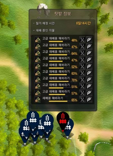 텃밭 아이콘을 누르면 텃밭의 위치와 정보를 볼 수 있고 일꾼을 투입시킬 수 있다