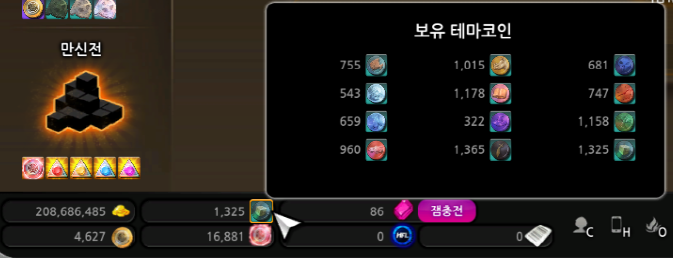 코인은 모든 캐릭터가 공유를 하며 보유한 코인은 네비게이션 창의
