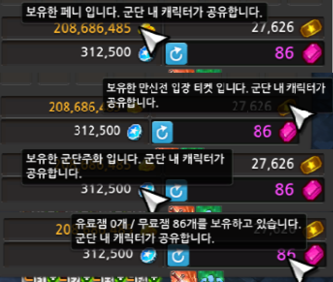 모든 캐릭터의 페니, 코인 등이 공유가 되고 장비, 기타 인벤토리칸만 따로 적용이 됩니다.