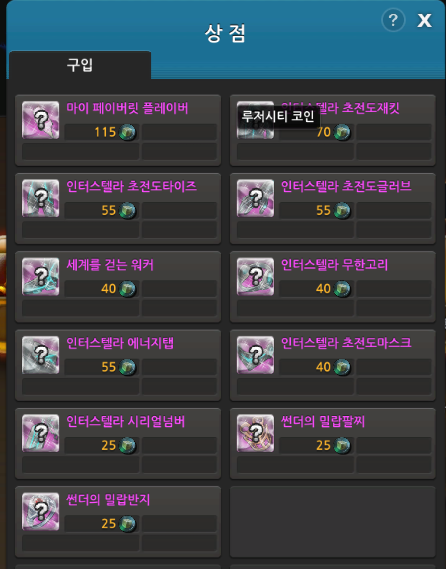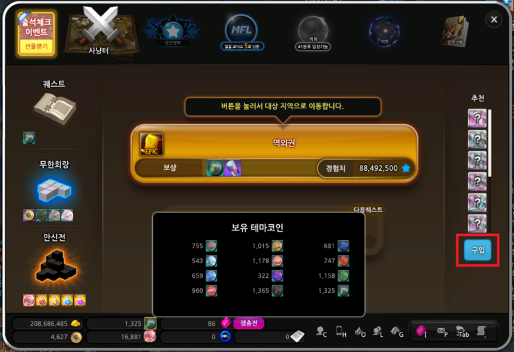 퀘스트보상과 사냥터에서 얻는 코인으로 구매할 수 있습니다.