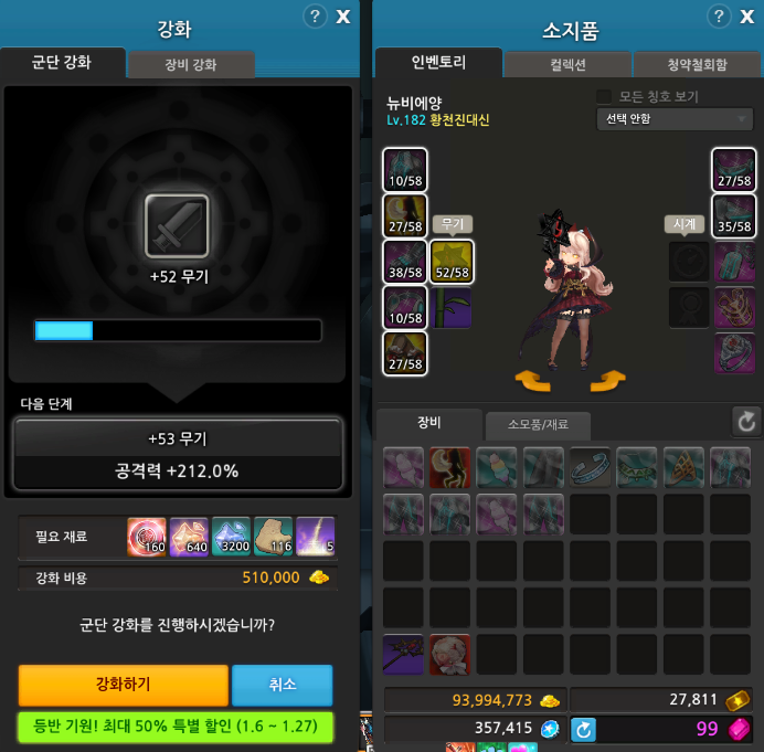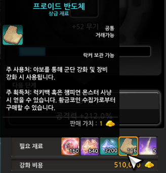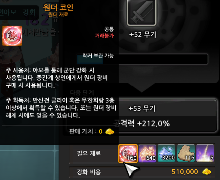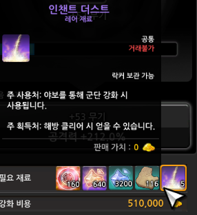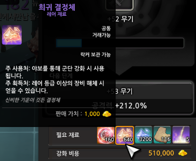 여기서 소소한 팁으로 필요 재료들은 인벤토리가 아닌 창고에 넣어두어도 강화가 가능하니