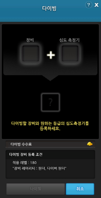 다이빙에 필요한 재료는 원더등급 장비와 심도 측정기 그리고 페니가 필요합니다.