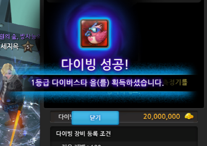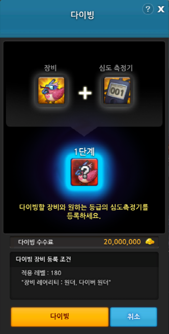 다이빙할 장비와 심도측정기를 채워넣고 아래 다이빙 수수료인 2천만 페니를 보유한 상태에서