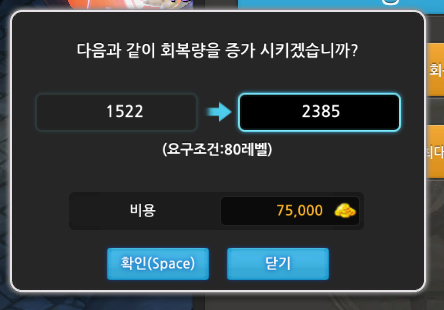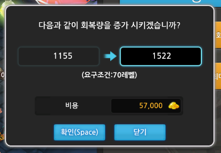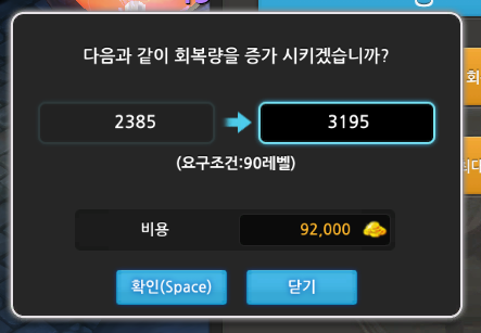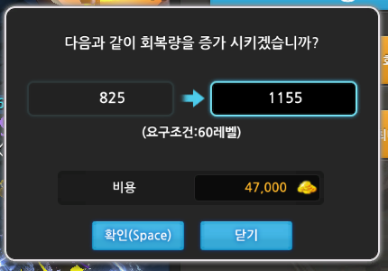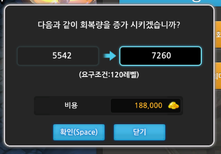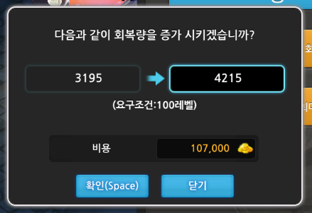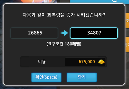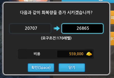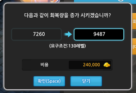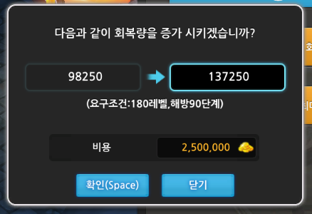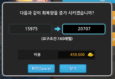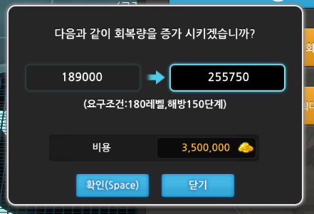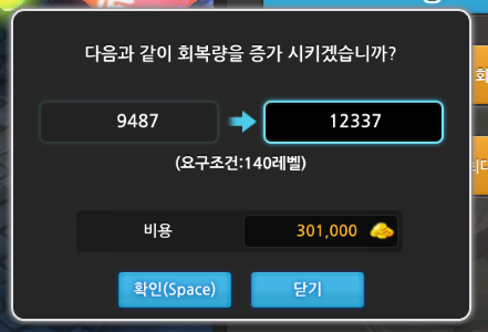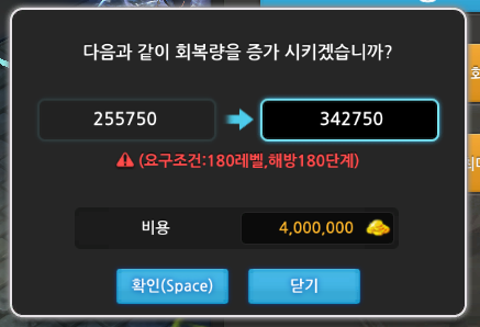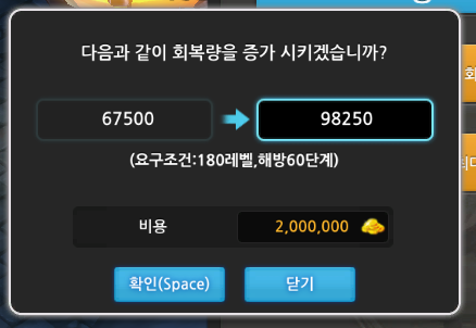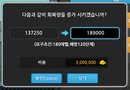 회복량 업그레이드 가격과 레벨제한을 알아보겠습니다