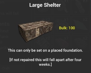 아래 사진은 라지 쉘터입니다. 이것은 집바닥위에 지어 살수있으는 집입니다. 한마디로 커다란 집입니다!