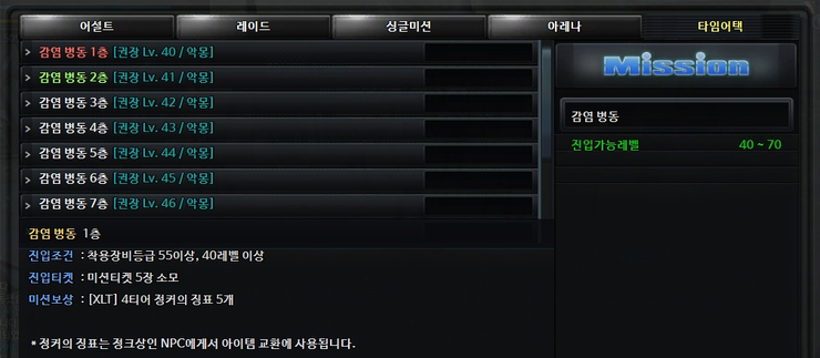 가장 조건이 낮은 병동 1층은 착용장비등급 55, 레벨40이상이 되어야하고,