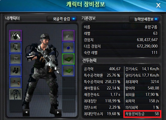 <장비착용등급은 I키를 눌러, 캐릭터 정보창에서 확인 할 수 있다.>