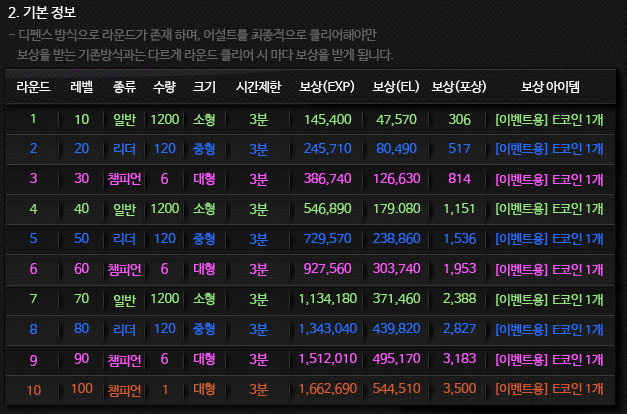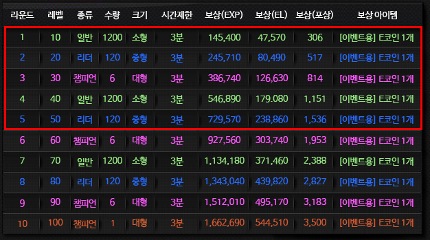 5단계까지 생존하고 클리어할 경우, 총 약 205만의 경험치와 약 67만 EL,  4324의 포상을 받게 됩니다.
