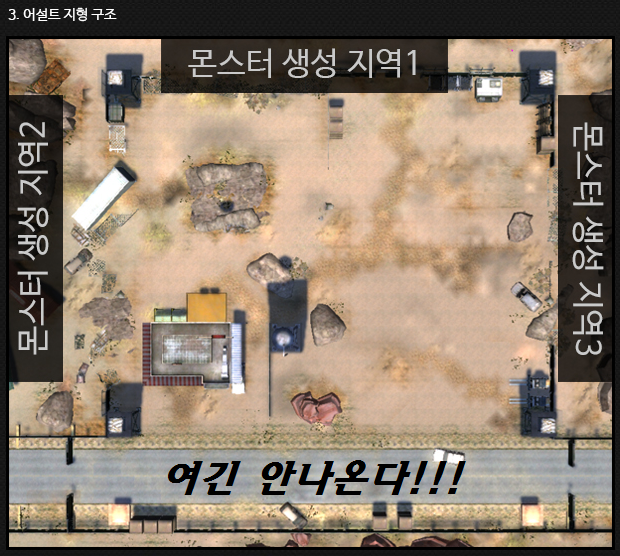 서부 보급기지 어설트는 개인플레이보다 '협력'이 강조되는 어설트 입니다. 따라서, 어설트 초반에 작전 포인트를 달성하지 못하여, 탈락하는 유저가 발생하지 않는 게 좋은데요. 1, 2단계에 등장하는 몬스터는 정말 매우 약해서, 금방 정리가 됩니다.