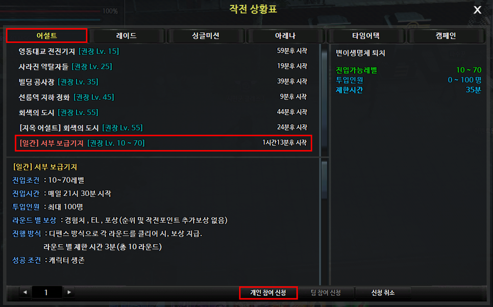 새로이 추가된 서부 보급기지 어설트는 최대 100명까지 참여 가능한 역대 최대 규모의 어설트이며, 하루에 한번!