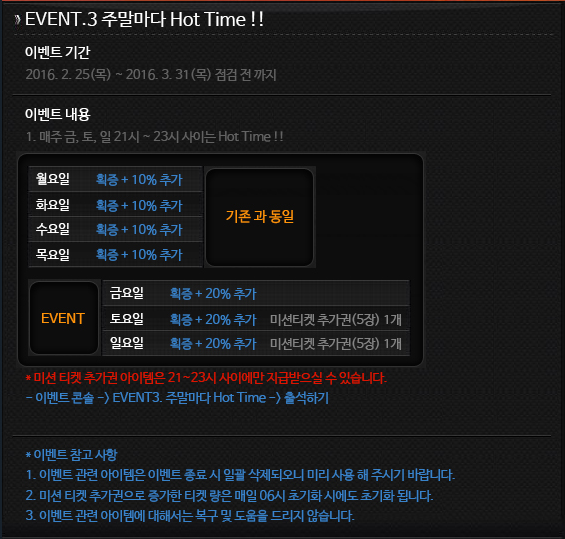 이벤트 내용을 간단히 요약해드리자면, 매일 저녁 9~11시 사이에는 획증(=획득 증가) 버프가 적용되는데요.