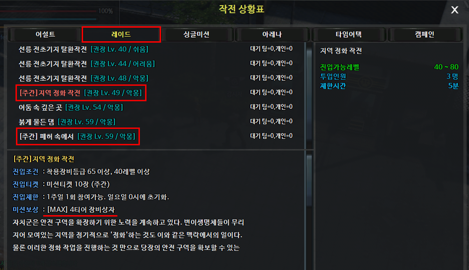 참고로 주간 레이드 중 난이도가 가장 낮은 '지역 정화 작전'이 레벨 40, 착용장비등급 65를 요구하는데, 이 요구를 '간신히' 충족한다 해도, 클리어하기 매우 어려울 것이다. 필자는 이 단어를 싫어하고 사용하고 싶지 않았지만, 빠른 이해를 위해서 어쩔 수 없이 사용하자면, 결국 장비 중에서도 '좋은 장비', 결국 장비의 '스펙'이 좋아야 한다..
