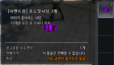 미미의 일일 미션 컨텐츠는 매일 하루에 한 번씩 받을 수 있으며, 3가지 미션 중 1개를 랜덤으로 받게 됩니다. 미션을 완료하게 되면, 보상으로 일정량의 포상을 받게 되며, 지금은 이벤트 기간이라 '포도맛 사탕'이라는 것도 1개씩 받습니다.
