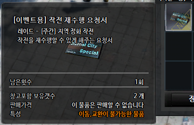 일주일에 한 번씩만 갈 수 있기 때문에, 한 번을 다녀오면 다음 주가 올 때까지 기다려야 하는데, 이 '작전 재수행 요청서' 아이템을 사용하면, 주 중에 입장한 횟수가 초기화되기 때문에 한번 더 입장할 수 있게 된다.