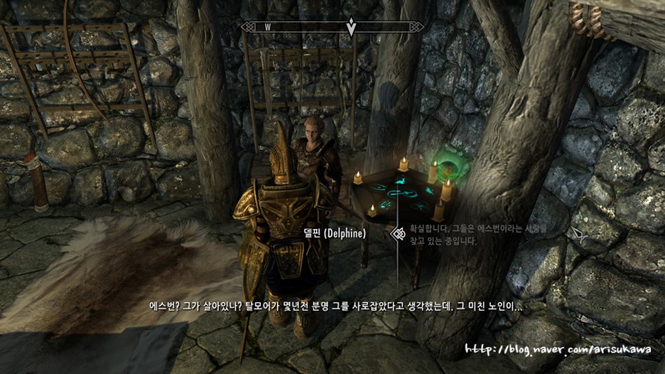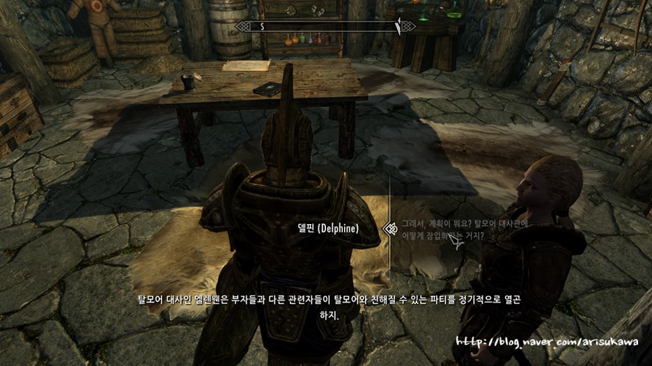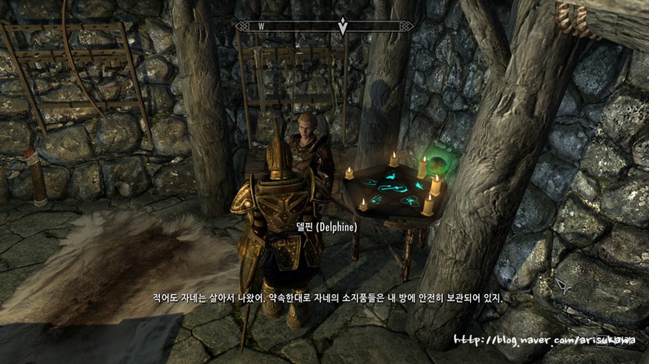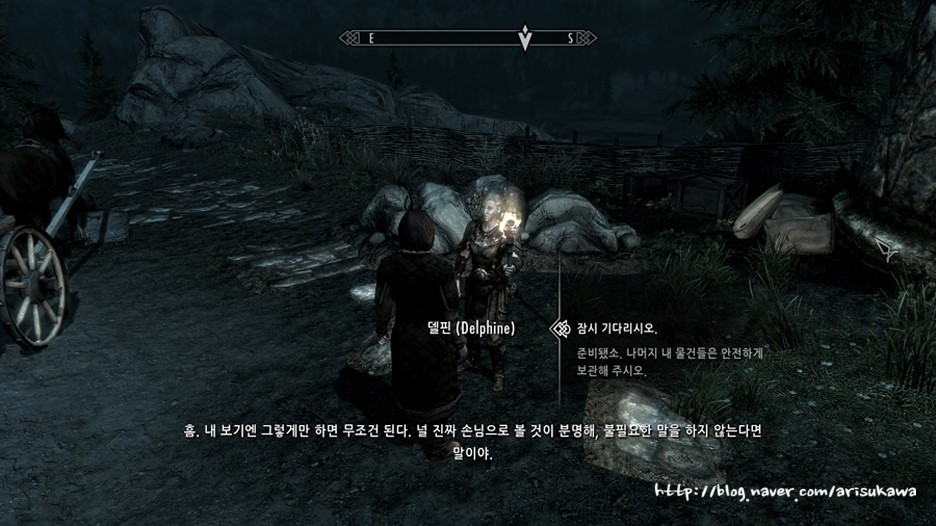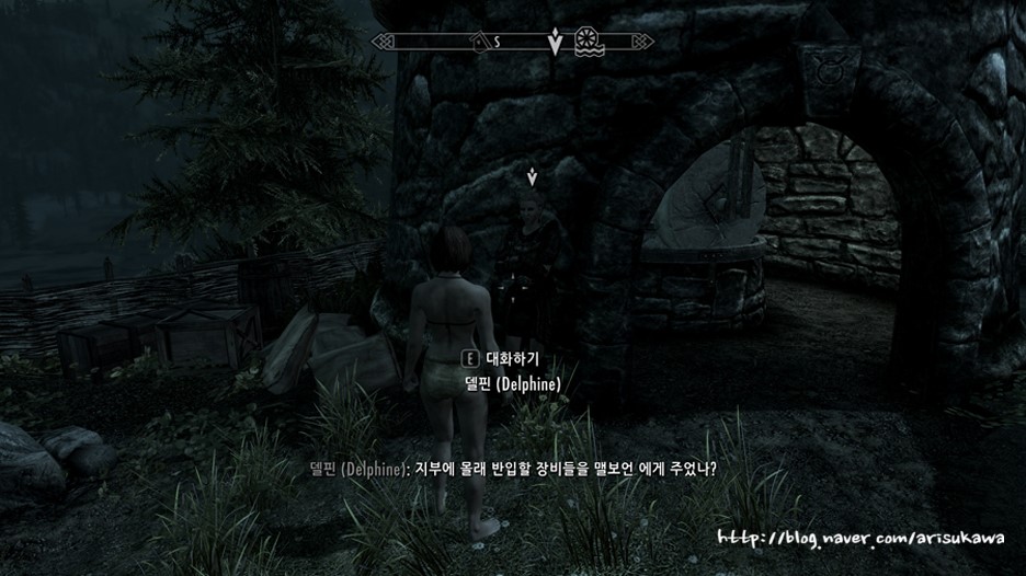 맬보언과 헤어진후에 솔리튜드 근처에있는 마구간으로 이동을 하면 그곳에서 모든 준비를 끝마치고있는 델핀을 만날수 있습니다.