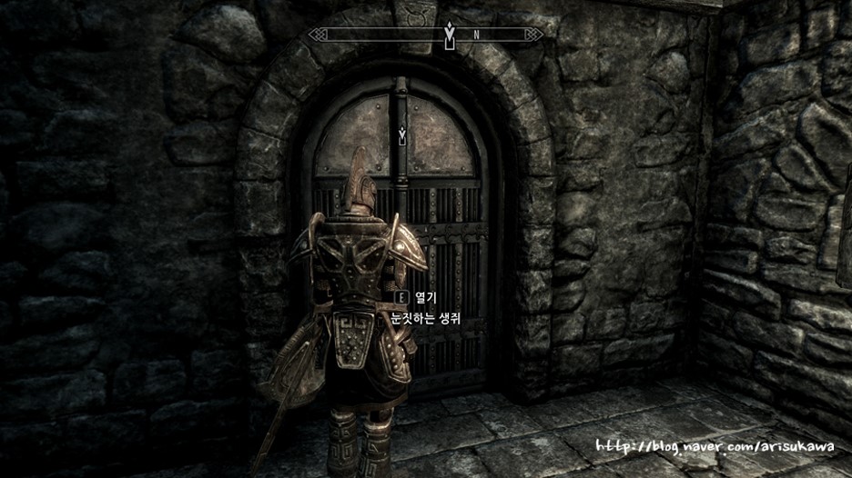 내부에있는 경비병에게 다가가서 방패를 사용해 강렬한 뒷통수치기를 시전!