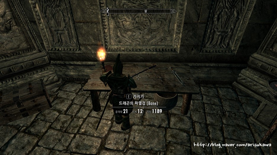 그리고 용을 잡을때 꽤나 쓸만한 무기인 드래곤베인도 바로 옆에있는 테이블에서 획득할수가 있습니다.