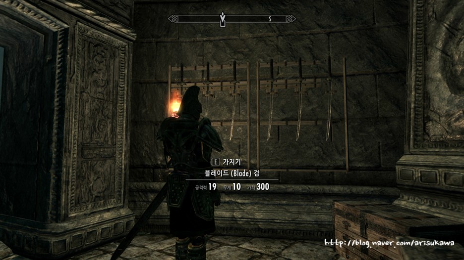 벽에는 블레이드의 검이 여섯자루가 걸려있으며 바로옆에 있는 상자에서는 블레이드의 방어구들을 획득할수 있습니다.