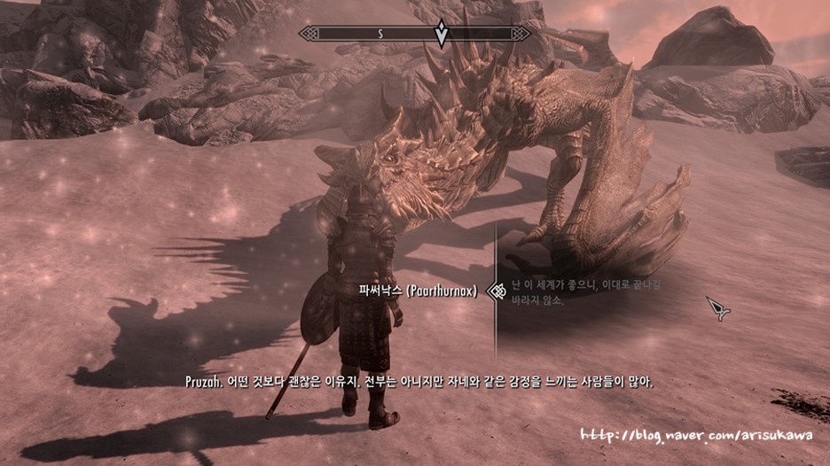파서낙스에게 최종적으로 인정을 받게된후에 알두인과 스카이림의 세계에 관해서 이것저것 대화를 시작합니다.