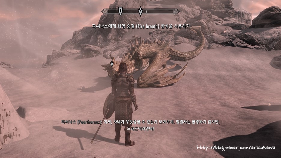 그곳으로 이동을 하면 화염숨결이라는 외침을 배울수가 있는데 이것을 배운후에 파서낙스에게 화염숨결을 시전하면 조건은 충족됩니다.