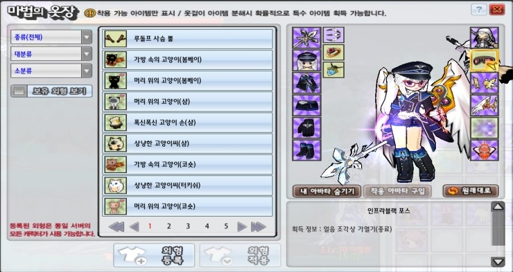 마법의 옷장에서는 외형등록이 가능한 모든 아바타와 장비를 직접 입어볼 수 있습니다.