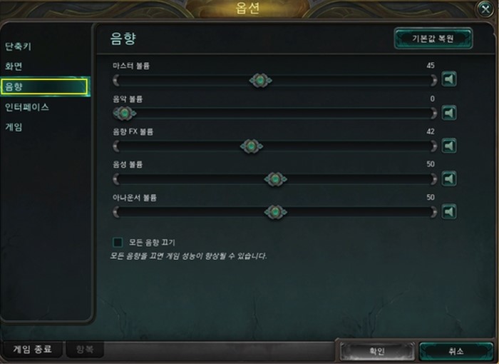 마찬가지로 ESC를 눌러 옵션창을 띄우면 오른쪽 상단에 기본값 복원이 있으며