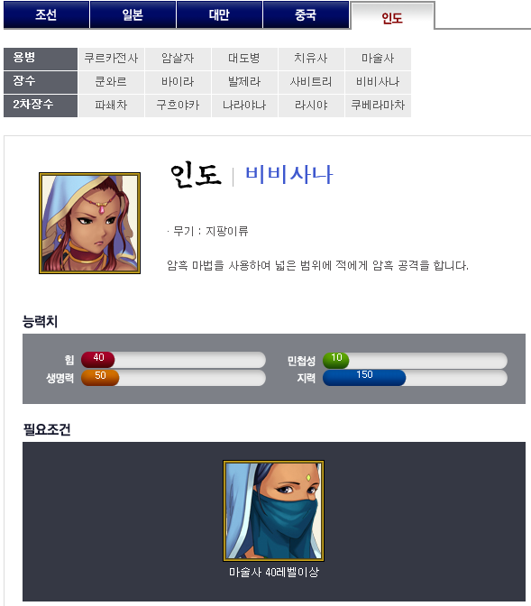 일단, 예전 구 2차장수중에서는 마술사 용병 구입하자마자 바로 만들 수 있는 1차장수 비비사나를 따라갈 장수가 없습니다.