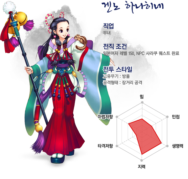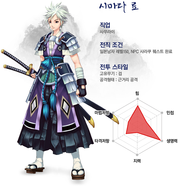 전직 후(後)에는 나라와 성별 총 8개의 각자 다른 특성이 나타나기에 각자 스텟이 다르고, 무기에 따라서도 달라집니다.