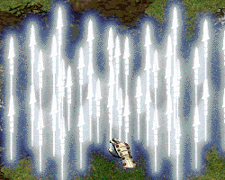 | 마나소모:200mp 범위:중대범위 기능:하늘에서 창줄기가 떨어져 부서지면서 적에게 피해를 입힘. 공식:데미지= 힘×12 + 공격력×10 설명:창줄기마다 1/2의 스플래쉬데미지를 산생. 스텟:힘 |