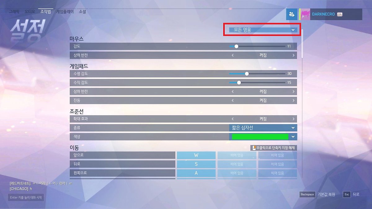 FPS에선 명중률을 좌우하는 마우스 감도와 인게임 감도, 그리고 순발력을 결정하는 단축키가 중요하다. 오버워치 역시 이들을 모두 유저의 편의대로 설정할 수 있도록 하고 있다. 오버워치의 설정에 들어가면 마우스와 컨트롤러, 단축키 등을 조정하는 페이지가 나오는데, 이 첫 번째 페이지는 모든 영웅에게 동일하게 적용되는 것이다. 하지만 영웅마다 스킬과 적정 감도가 상이하므로 우측 상단을 클릭하여 영웅별로 따로 맞추어두는 게 좋다.