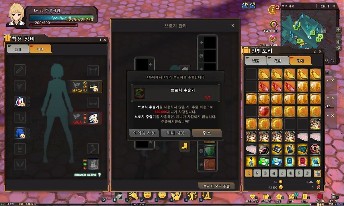 이미 코스튬에 장착한 브로치는 브로치 추출기 아님 560000 제니로 빼낼 수 있습니다. 추출기는 개당 3500원입니다. 제니로 추출할 경우 한번 추출할 때마다 제니가 어마하게 드니 신중히 생각하시고 장착시키는 게 좋을 것 같습니다.