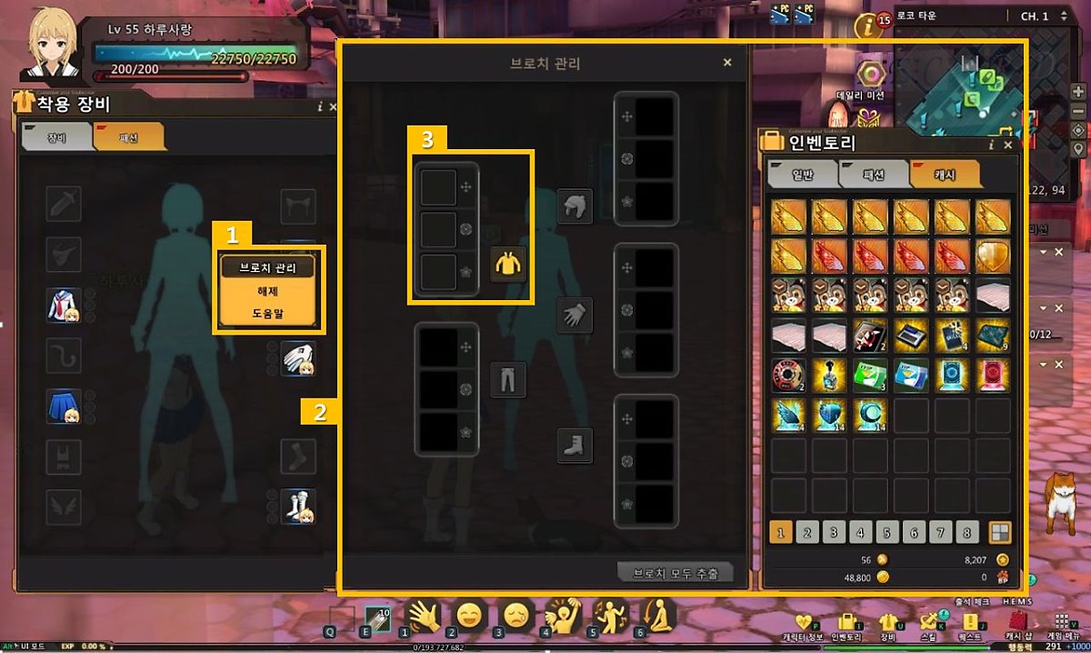 브로치는 장비 창, 패션에 있는 코스튬에 장착시킴으로서 공격력, 방어력 등 능력치를 높일 수 있는 아이템입니다. 단축키 U에서 패션으로 들어가 코스튬을 우 클릭에서 브로치 관리를 통해 사용하실 수 있습니다.
