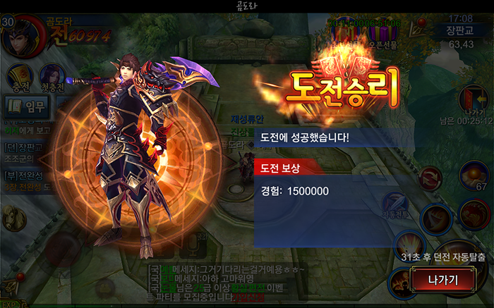 처음엔 천명 컨텐츠중 하나인 파티사냥이나 스토리모드를 이용하면 될 것 같아 진행해봤는데 생각만큼 팍팍 오르지가 않기에 찾아보니 '장판교'라는 이름의 던전이 바로 경험치를 대량으로 주는 곳이라고 한다. 그래서 딱 한번 다녀왔을 뿐인데 150만의 경험치를 획득함과 동시에 30레벨대에 진입했다.