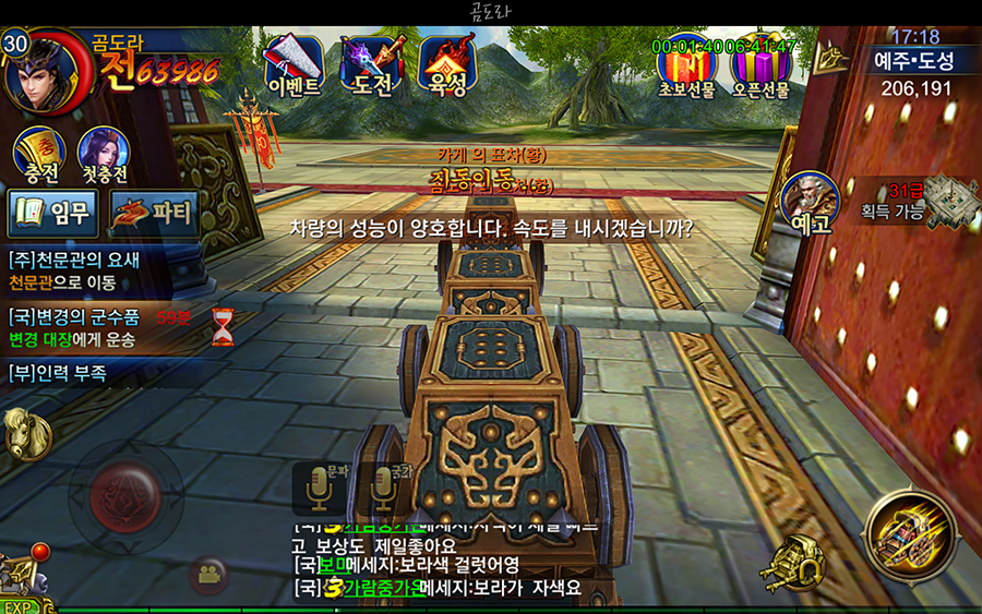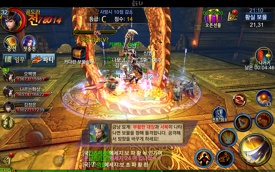 그 외에도 유저들간의 실시간 파티사냥인 '황실 밀실/편전/보물'에선 경험치와 아이템을 얻을 수 있는데, 난이도가 그리 어렵지 않고 파티의 생성과 참여시스템이 잘 만들어져 있어 빠른 진행이 가능하다. 그리고 캐릭터카드를 얻어 영웅을 강화시킬 수 있는 '명장 시련' 등 던전형 컨텐츠만 약 10개가까이 되는데 모두 전투력강화에 도움이 되는 것들이니 매일매일 돌아주는 것이 좋다