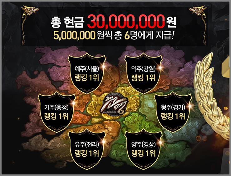 이렇게 천명은 오픈을 맞이하여 다양한 이벤트를 진행중인데 그 중 몇가지만 이야기해 보자면, 먼저 전국을 6개의 지역으로 나누어 진행되는 대규모전투에서 각 지역의 랭킹 1위에게는 푸짐한 보상이 지급된다고 한다. 마치 스타나 롤과 같은 PC게임대회를 방불케 하는 상금이 모바일MMORPG에 걸려 있다는 것이 놀라운데 그만큼이나 치열할 것으로 기대가 되며, 상대적으로 유저가 많이 몰리지 않는 지역을 찾는 것 또한 좋은 공력방법이 되지 않을까 싶다.