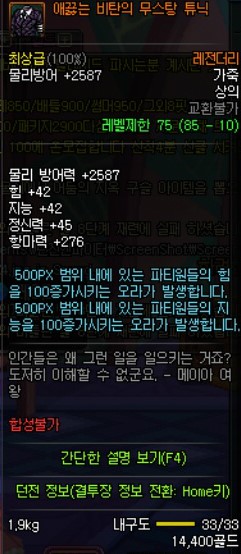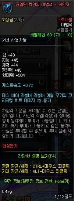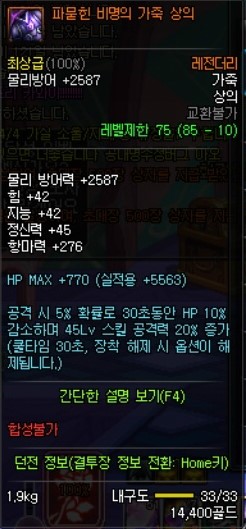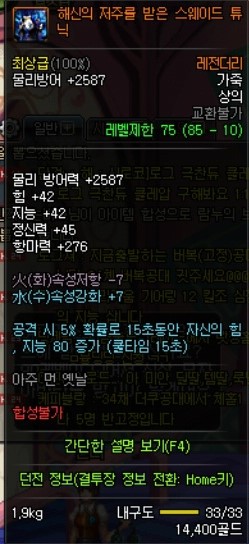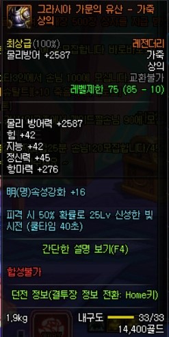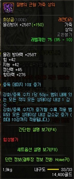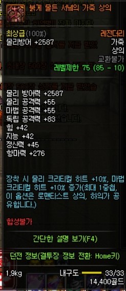 이 아이템의 장점은 준수한 방어구의 각종 옵션 (미칠듯한 속강)